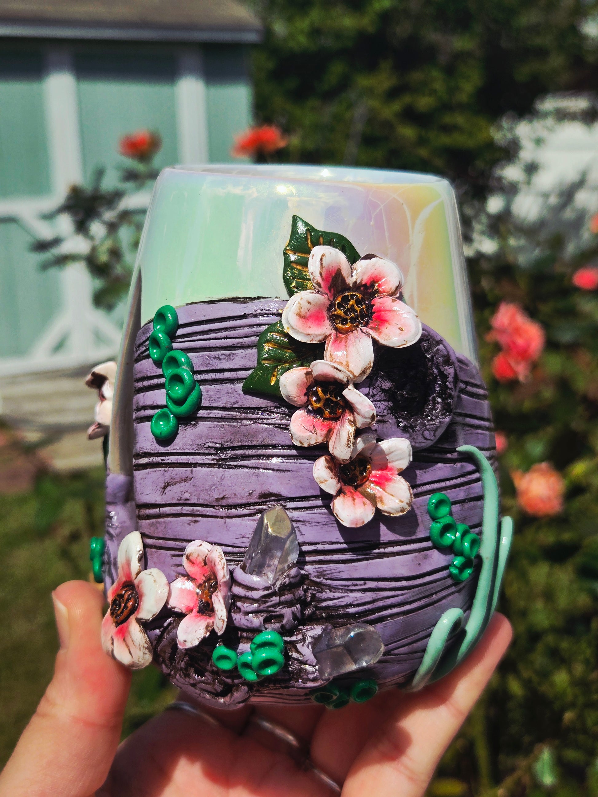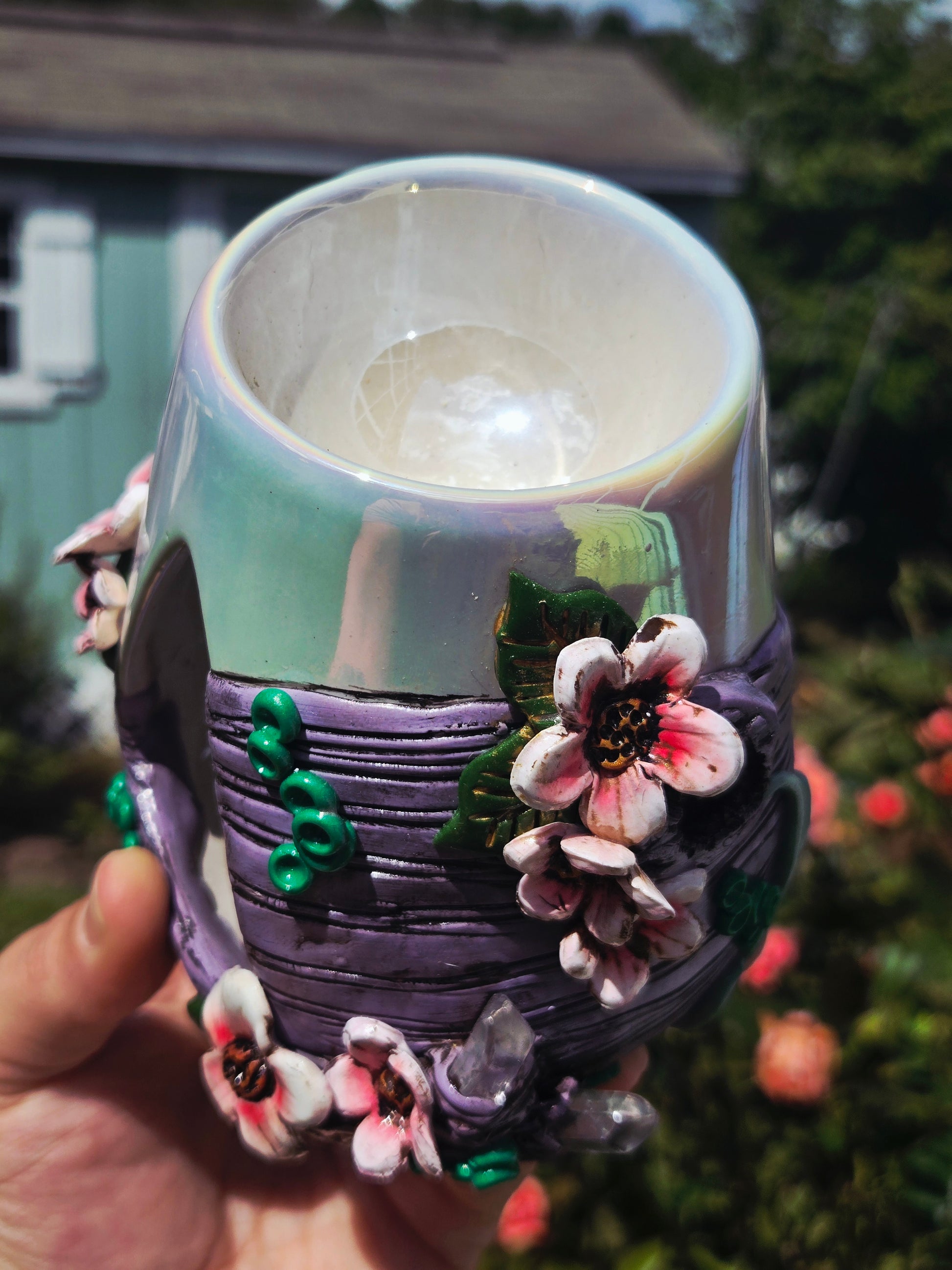 Bring a touch of whimsy to your space with this handcrafted aura wax/oil warmer, adorned with delicate blossoms, crystal details, and a shimmery, iridescent finish. This unique piece is perfect for infusing your home with your favorite scents while adding a fairy-tale charm. You will receive the exact piece shown – a one-of-a-kind treasure made with love and intention.