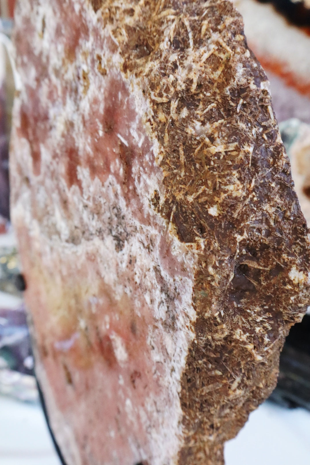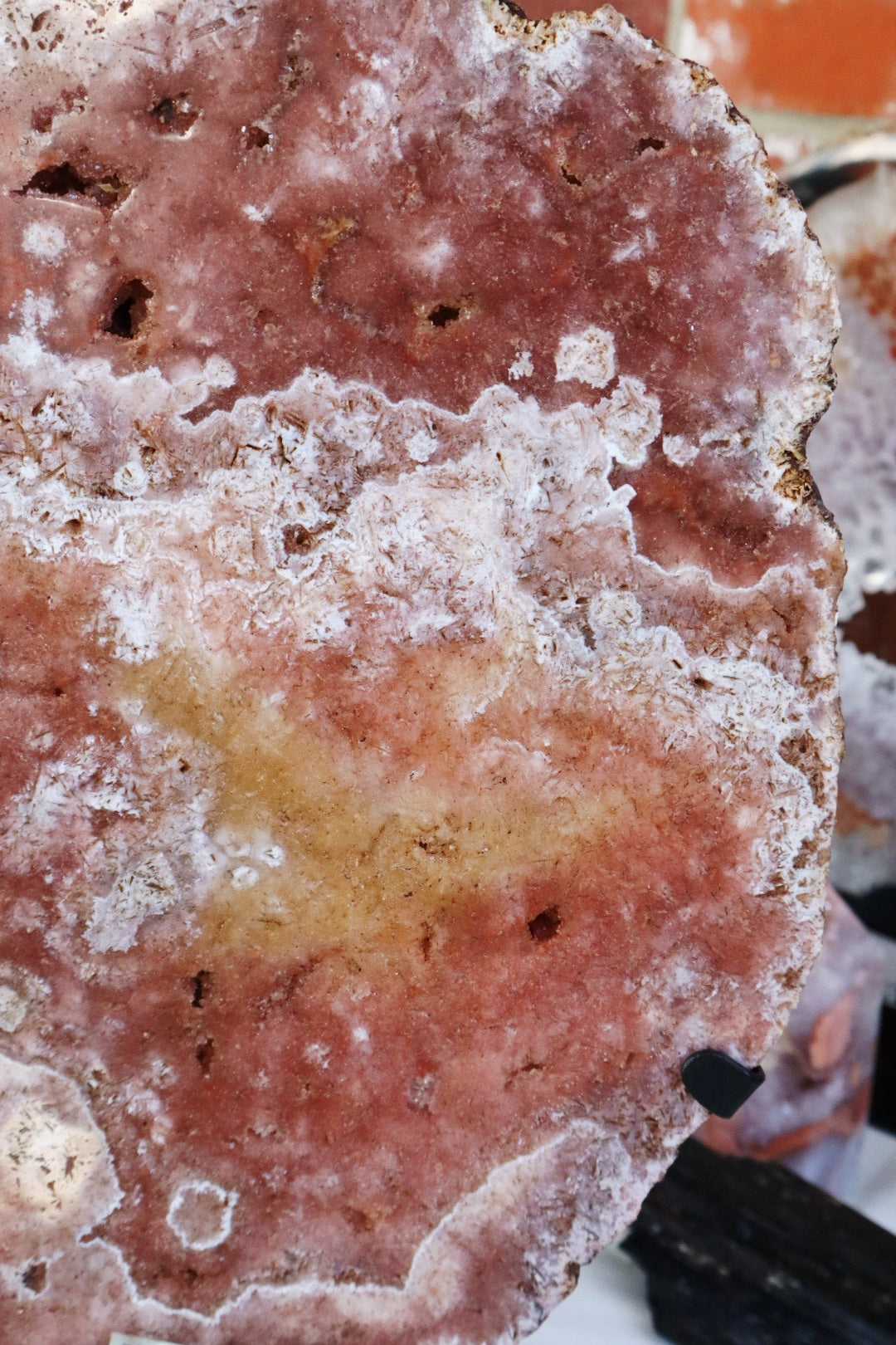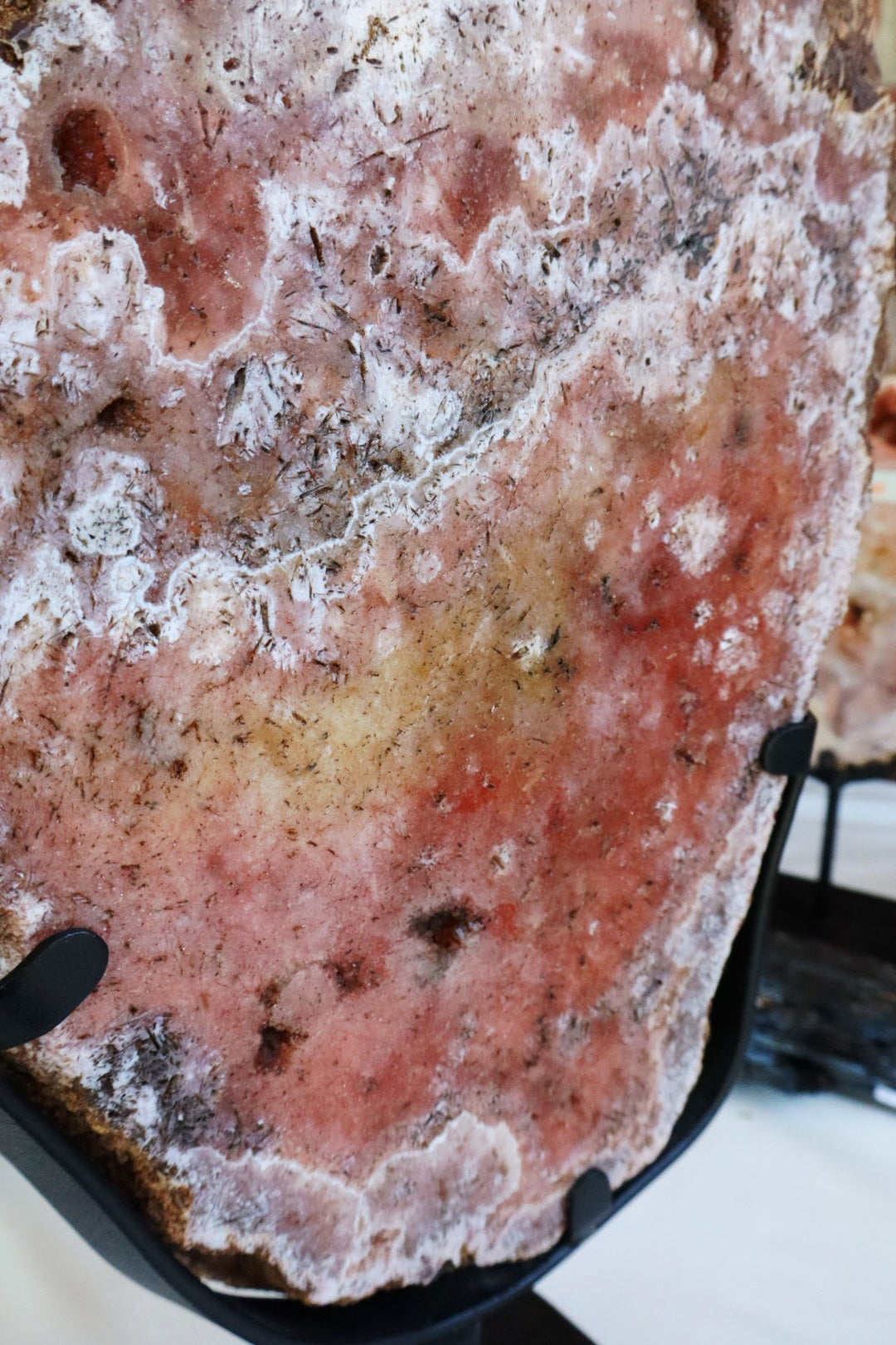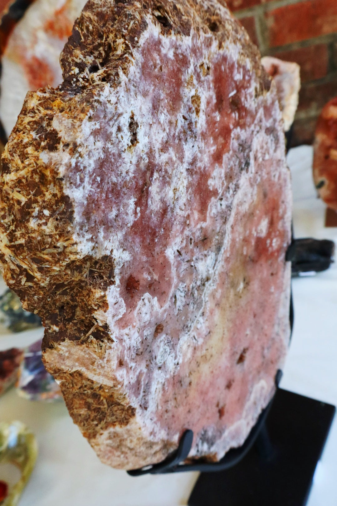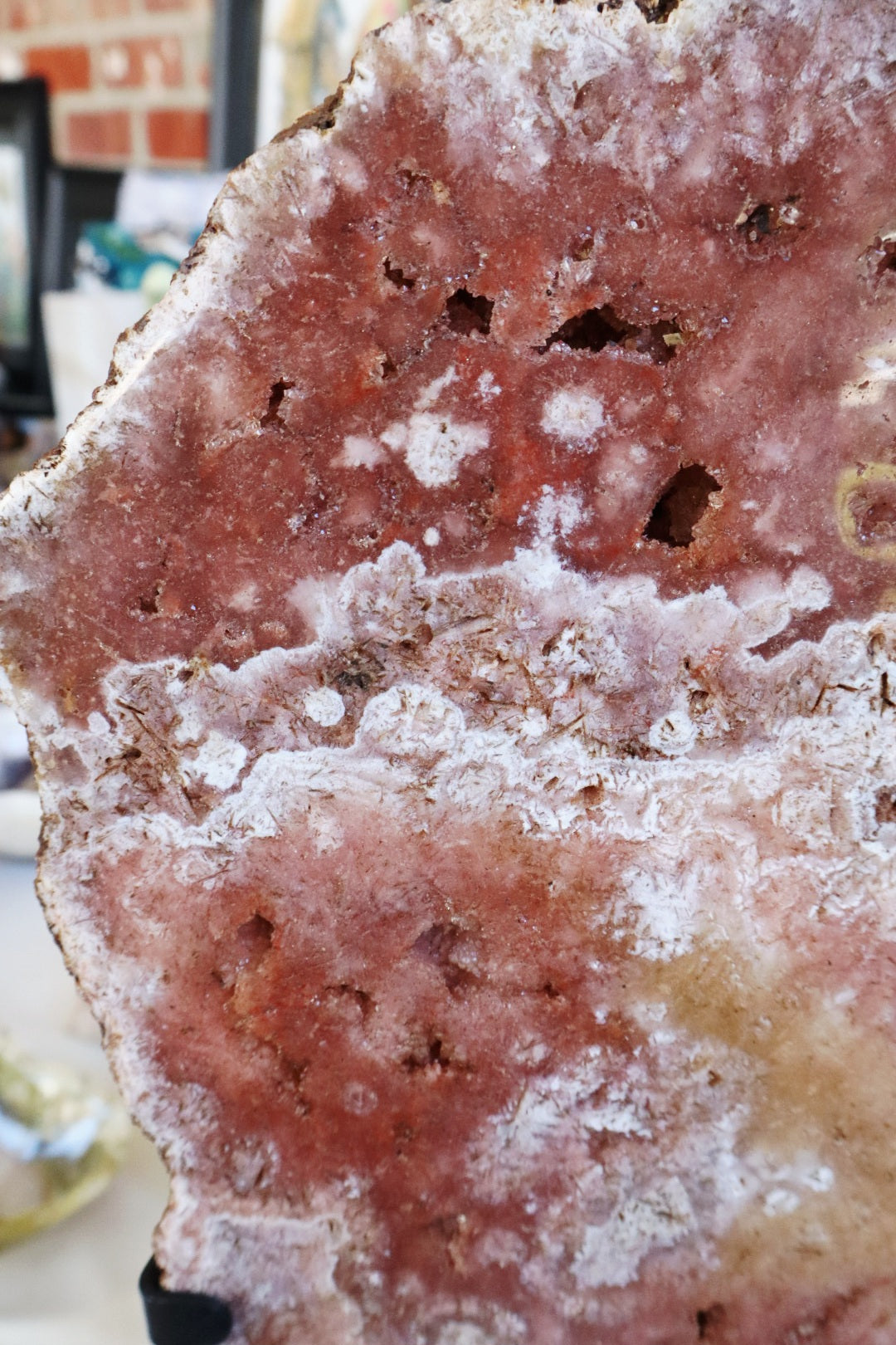 This beautiful sunset vibes looking pink amethyst is not only thick but heavy a wonderful statement piece. Comes with a sturdy custom stand