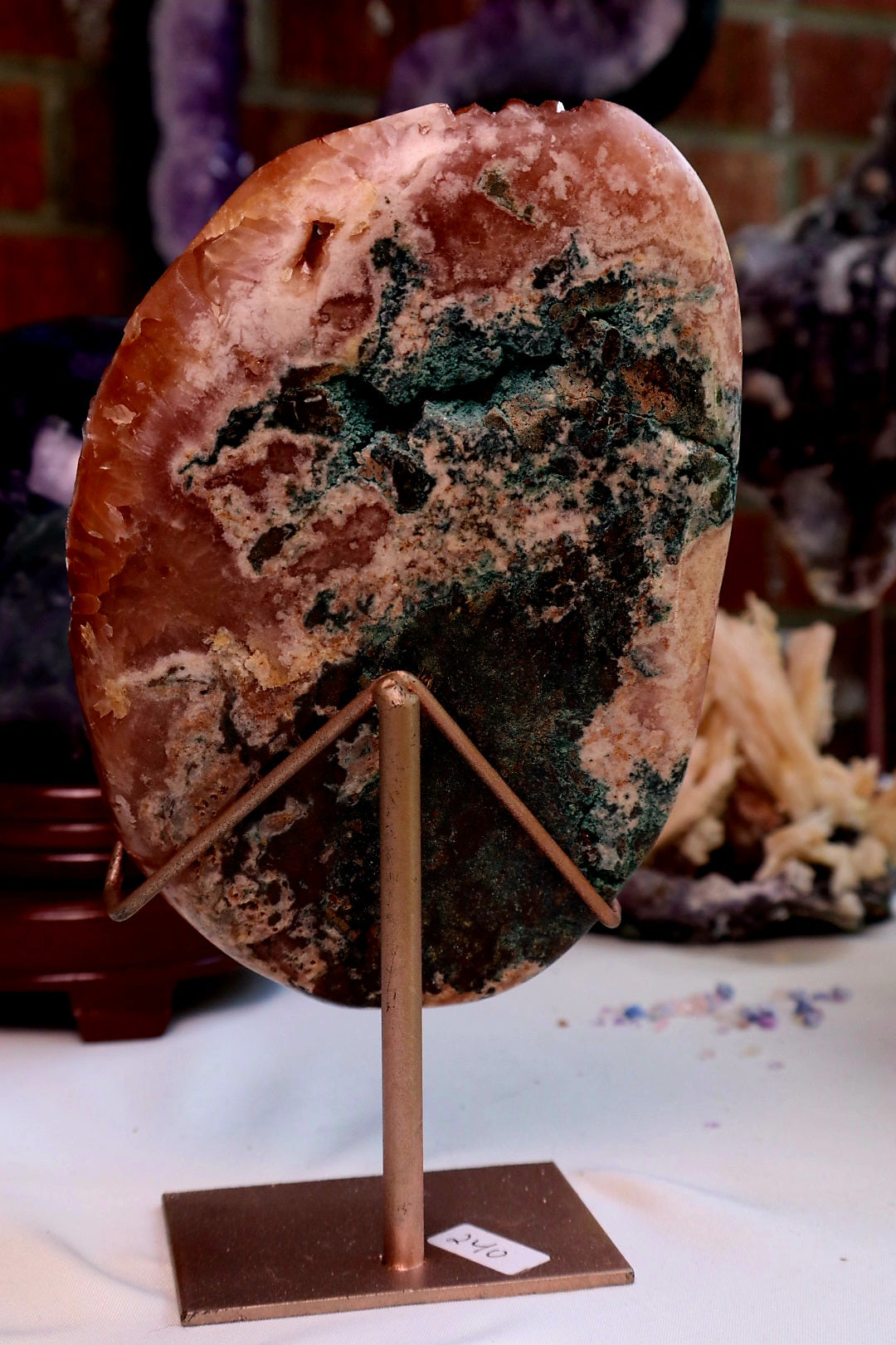 A+++ red druzy pink amethyst slab on stand. Jasper on the back. Beautiful statement piece. 8 inches tall on stand , 4 5/8th side to side.