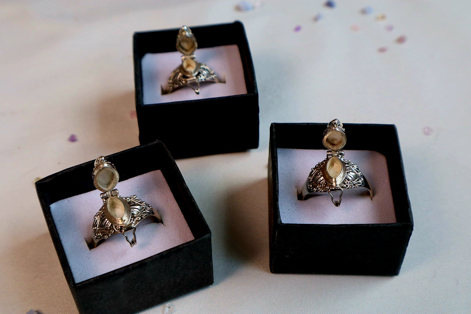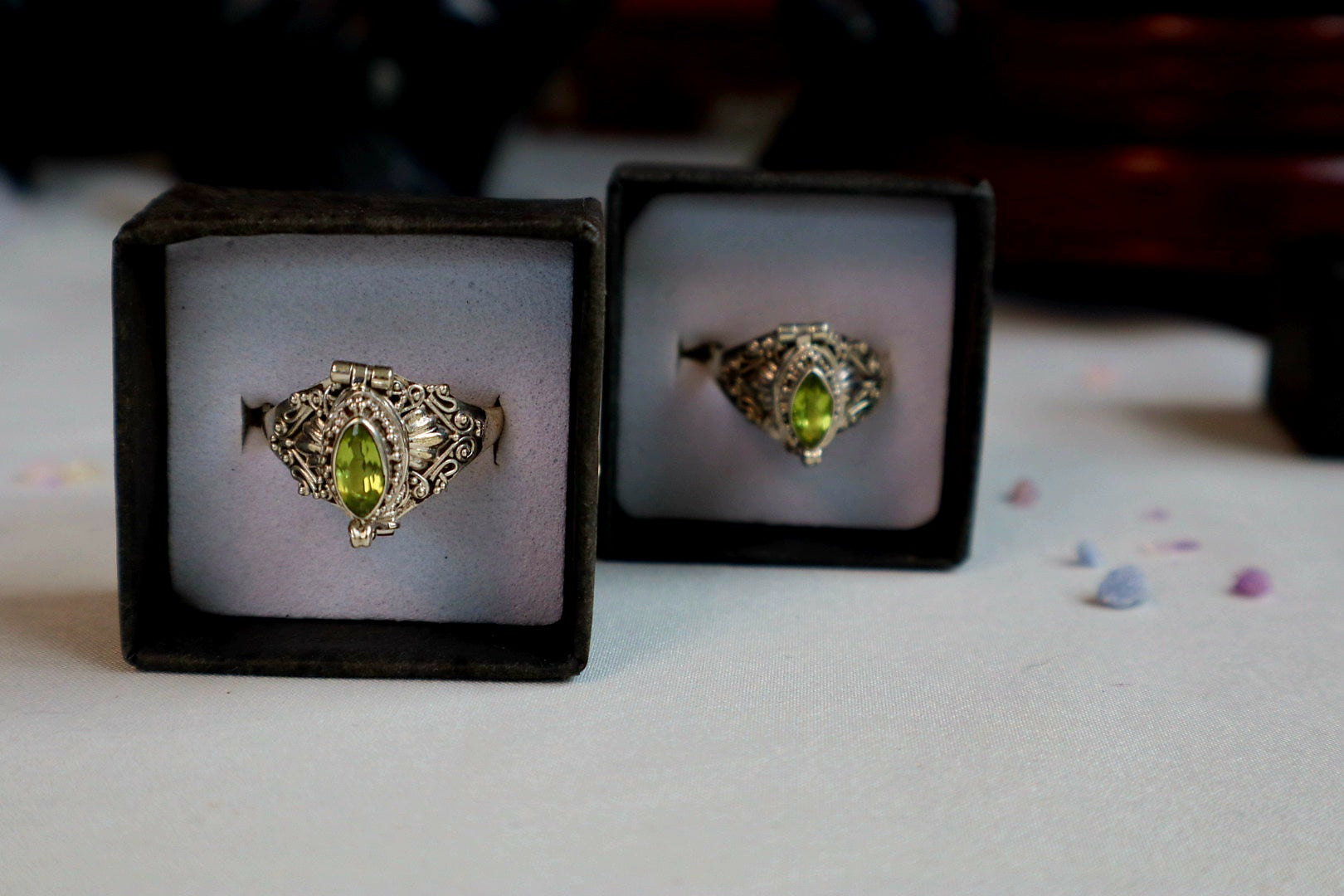 This poison ring is set with a genuine gemstone and is crafted of solid sterling silver. It opens to reveal a secret compartment that could hold small pills, a prayer, or other small important keepsakes. Crafted of sterling silver and marked 925.